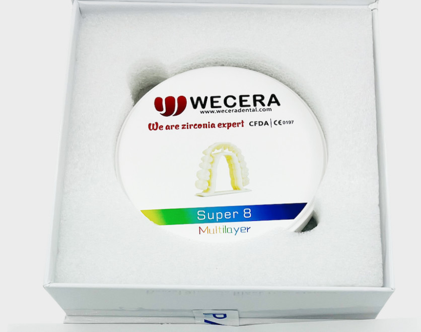 قرص زيركونيا متعدد الطبقات Wecera Super 8 هو كتلة زيركونيا أسنان متقدمة مصممة لتلبية أعلى معايير ترميم الأسنان.إدارة الغذاء، و ISO13485، ضمان سلامته، الجودة، والامتثال للأنظمة الدولية للأجهزة الطبية. مع قوة الانحناء 900 MPa،توفر Wecera Super 8 متانة وموثوقية استثنائية لمجموعة واسعة من تطبيقات الأسنان.